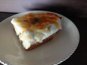 食パンに無えんせきハムをはさみ、ベシャメルソース、シュレッドチーズをかけて焼きあげました。